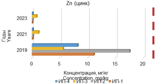 Рисунок 7. Динамика концентрации обнаруженного в почвенных образцах цинка в 2019, 2021 и 2023 гг.