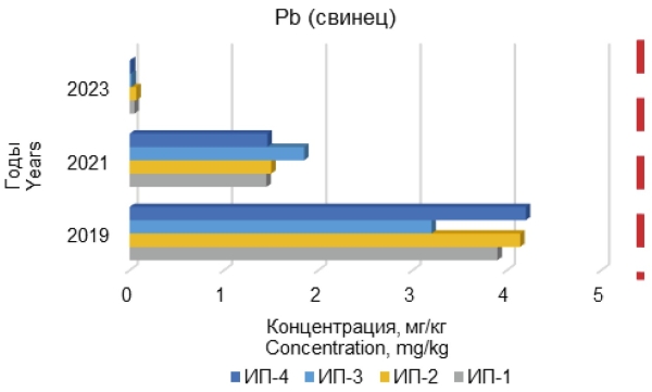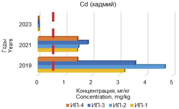 Превышения ПДК кадмия на 2019 г. составляли 9,4 и 7,2 ПДК для ИП-2 и ИП-3 соответственно. Данные показатели снизились в 2023 г. в 156 и 164 раза для ИП-2 и ИП-3 соответственно.