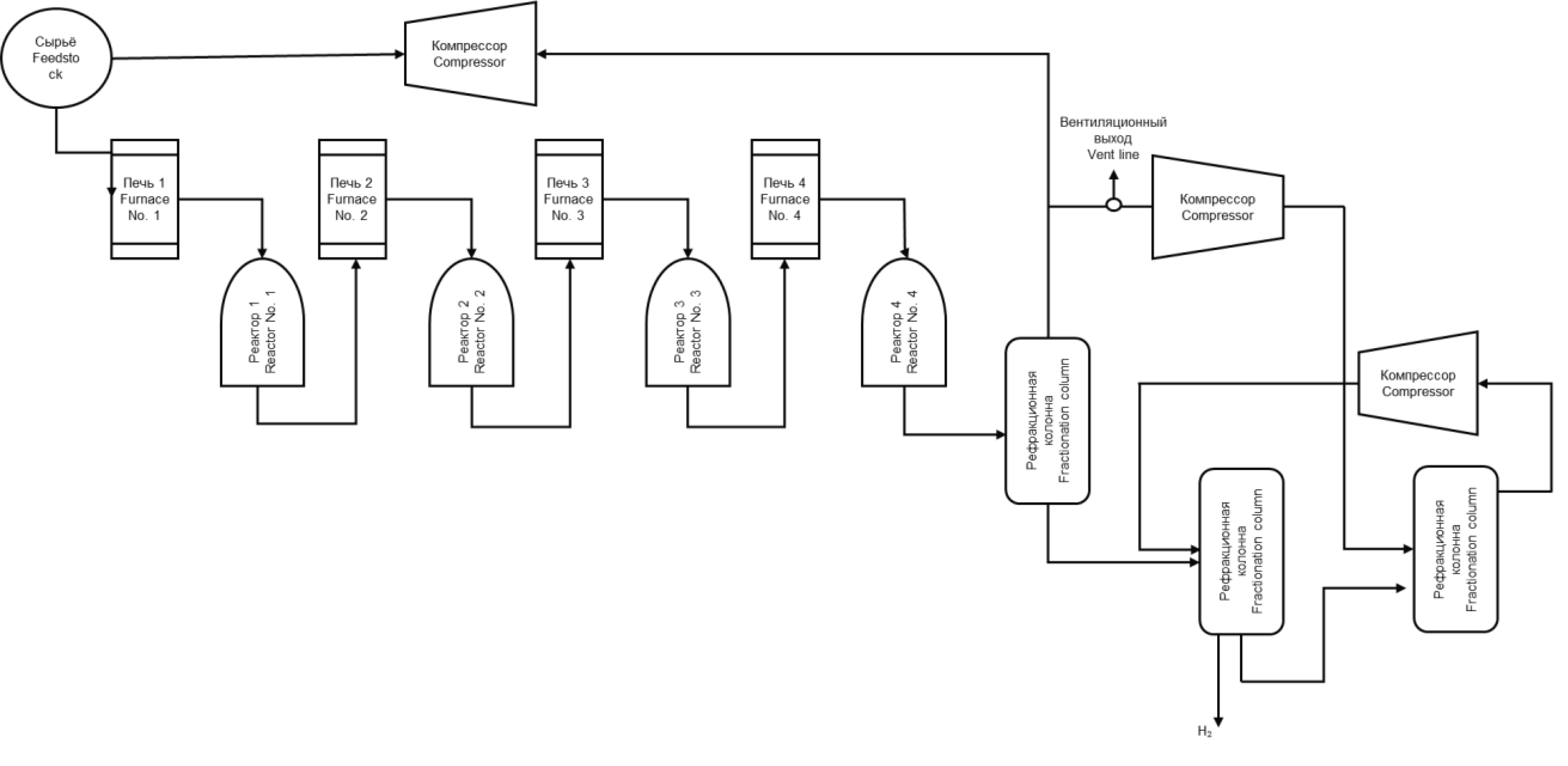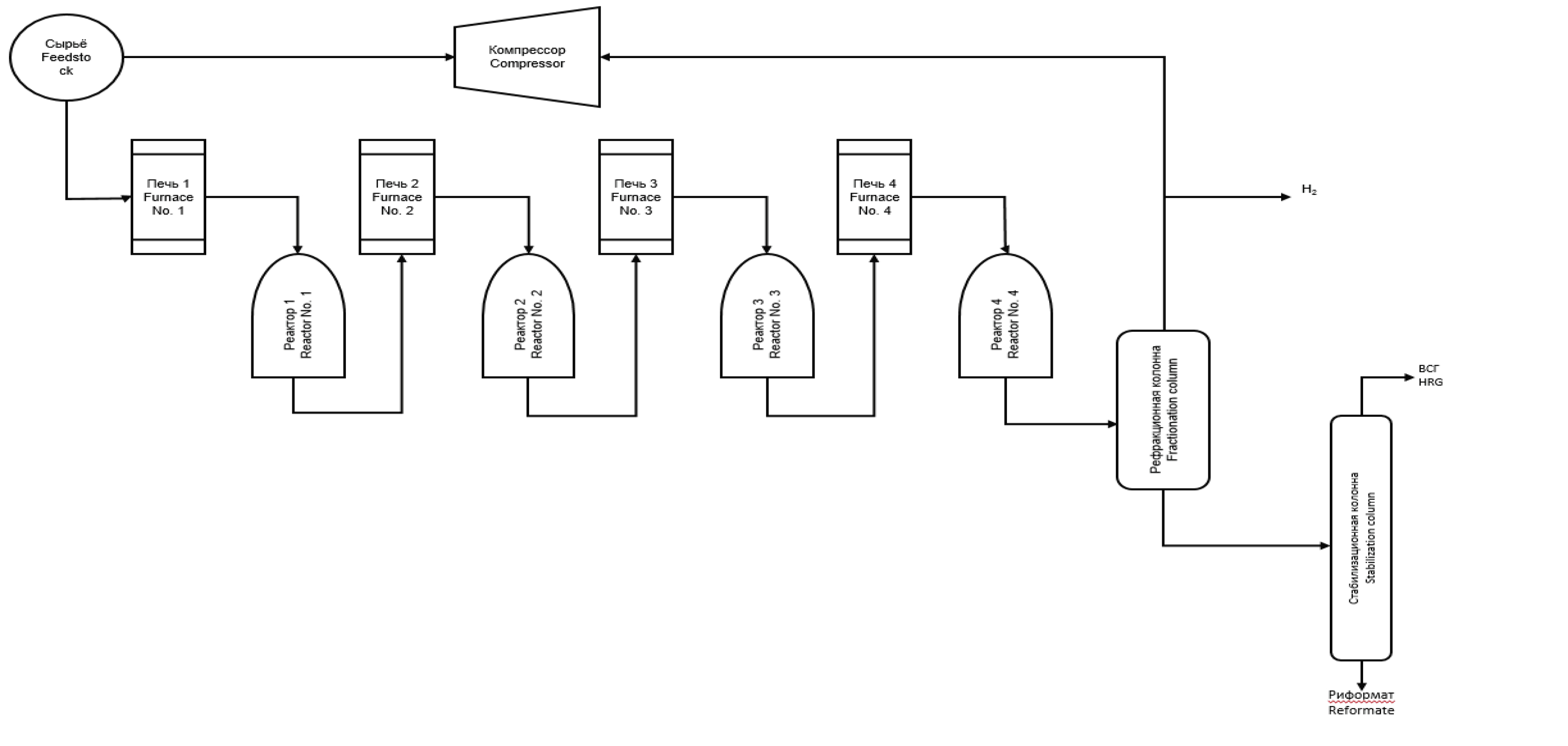 На ПНХЗ используется технология риформинга с неподвижным слоем катализатора, упрощённая схема которой представлена на рис. 2. Этот метод является одним из самых распространённых для переработки УВ с целью получения высокооктановых компонентов бензина и других нефтехимических продуктов [13, 14].