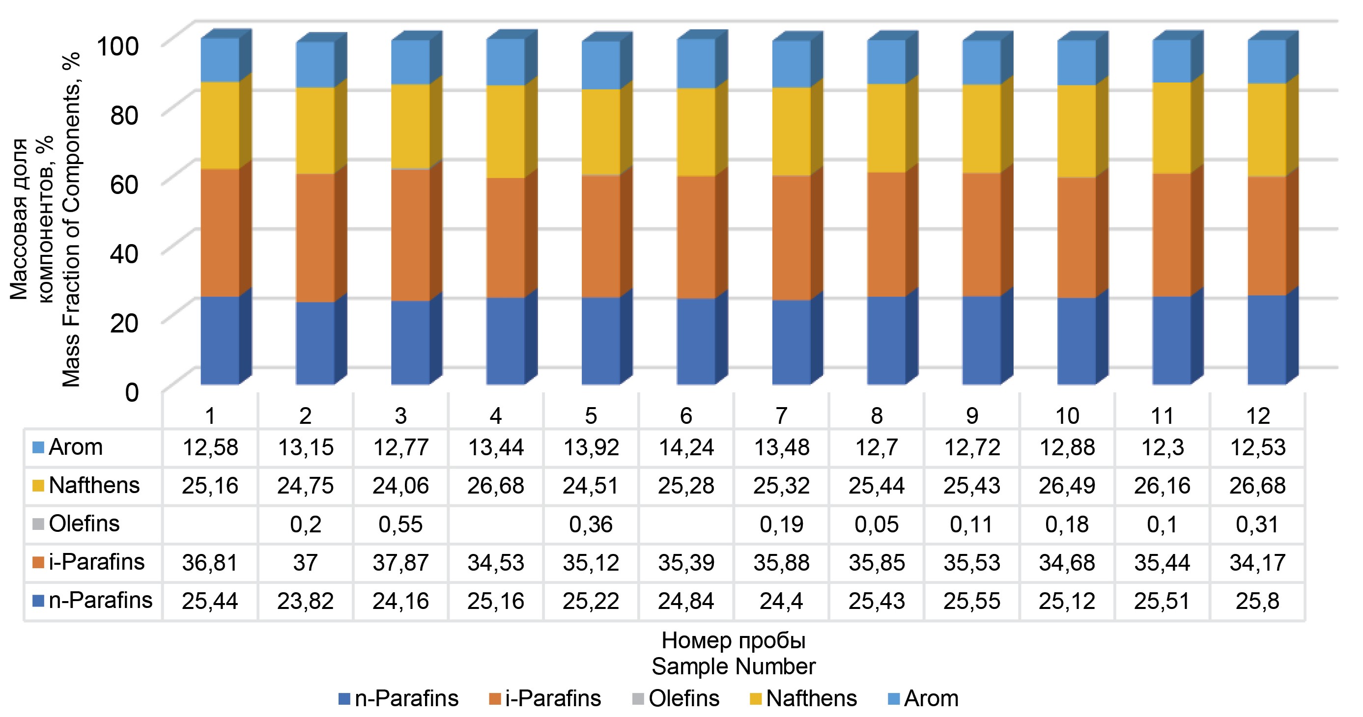 В 2023 г. групповой состав сырья для переработки демонстрировал значительную однородность, что положительно влияло на стабильность технологических процессов. Содержание н-парафинов, изопарафинов, нафтенов и ароматических соединений оставалось в пределах относительно узких диапазонов, что способствовало предсказуемости работы установок риформинга и улучшало управление производственными параметрами.