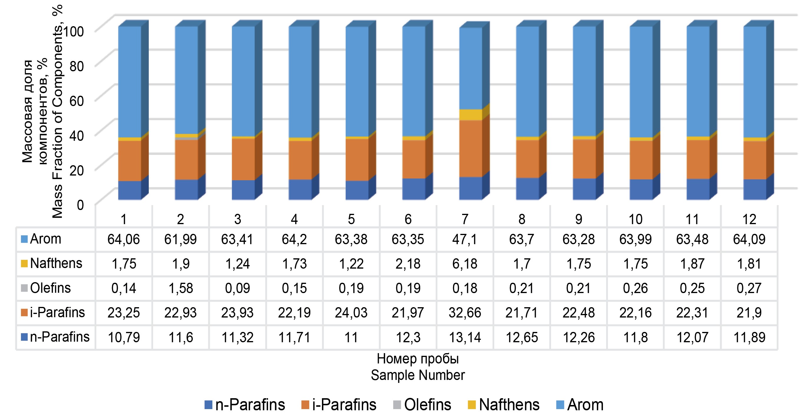 Анализ группового состава риформата показал значительное отклонение в пробе №7, что, вероятно, связано с проведением планового капитального ремонта на ПНХЗ в июле 2023 г. Временная нестабильность технологического режима в период пусконаладочных работ после ремонта объясняет зафиксированные изменения в составе риформата. Данную пробу целесообразно исключить из обобщённого анализа, чтобы избежать искажения результатов.