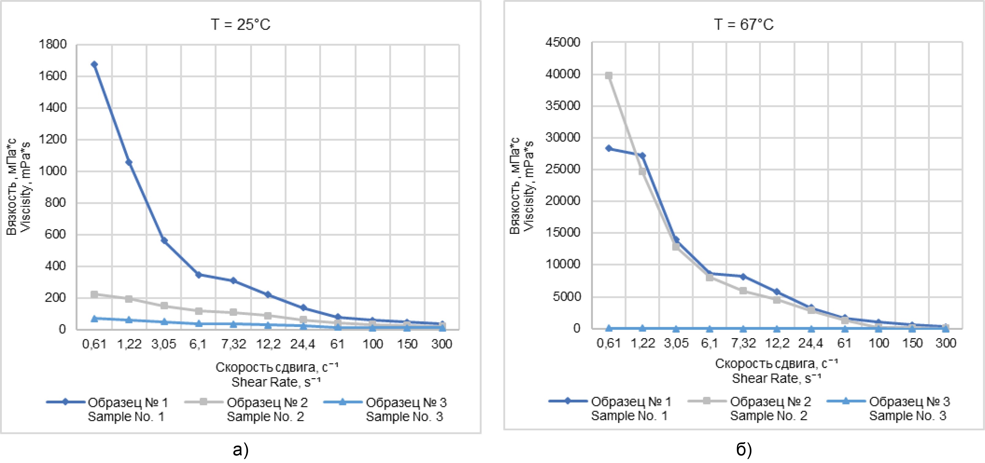 а) при 25°С / at 25 °C; б) при 67°С / at 67 °C