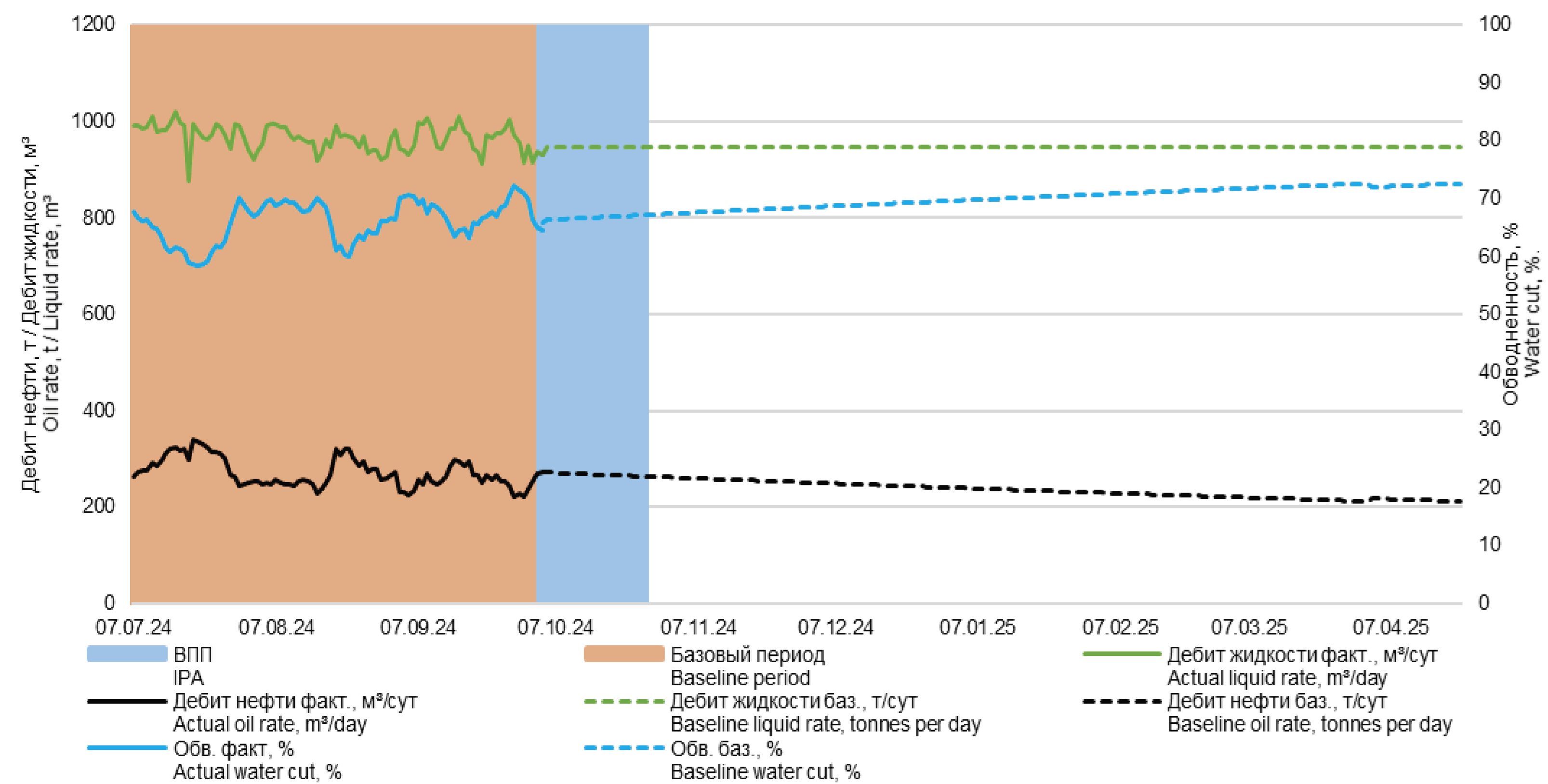 Полевое внедрение технологии ВПП продемонстрировало высокую эффективность. Фактическая дополнительная добыча нефти за период мониторинга составила 7024,8 т, что более чем в 3,9 раза превышает прогнозное значение. Снижение обводнённости составило 12,2%, в то время как прогнозируемое значение находилось на уровне 1%, что подтверждает положительное влияние технологии на перераспределение фильтрационных потоков и вовлечение остаточных запасов в разработку.