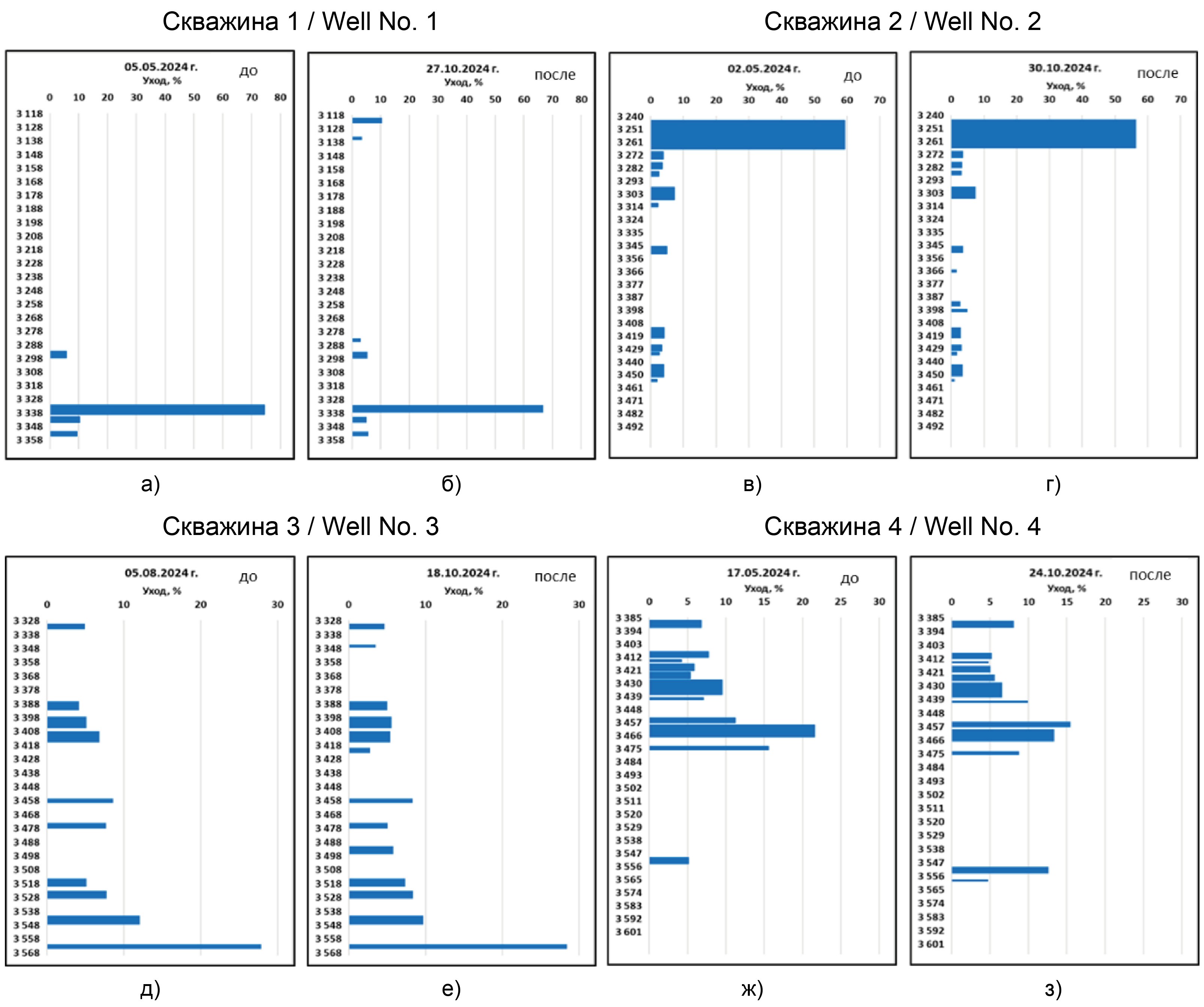 а) скв. 1, до / Well No. 1, before; б) скв. 1, после / Well No. 1, after; в) скв. 2, до / Well No. 2, before; г) скв. 2, после / Well No. 2, after; д) скв. 3, до / Well No. 3, before; е) скв. 3, после / Well No. 3, after; ж) скв. 4, до / Well No. 4, before; 3) скв. 4, после / Well No. 4, after