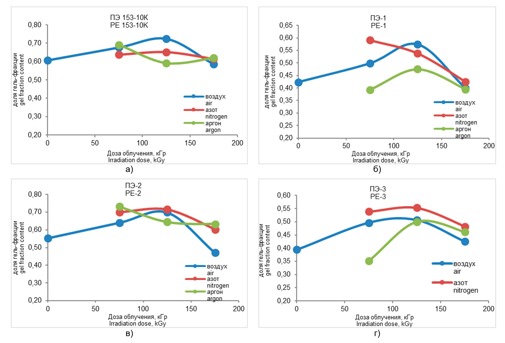 Различия между аргоном и азотом минимальны, однако в отдельных случаях (например, у ПЭ-2) аргон обеспечивает чуть более высокие значения гель-фракции, что может быть связано с большей плотностью и более эффективным вытеснением кислорода из образца.