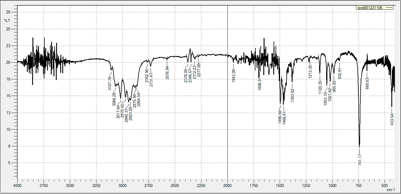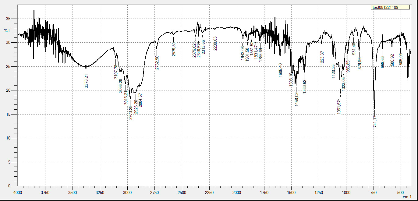 Как видно из ИК-спектров экстракта полимеров, основные линии поглощения свойственны для растворителя ксилол, а именно: 3107, 3066, 3017, 2923, 2875, 1120, 1053, 1021, 741, 433 см–1. Данные линии присутствуют на всех спектрах всех образцов.