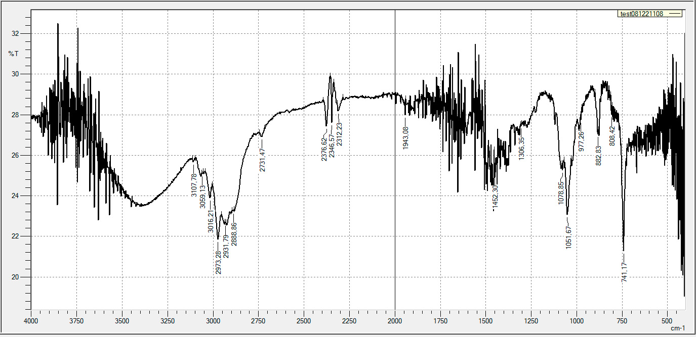 На рис. 2–5 представлены ИК-спектры гель-фракций материалов после экстракции. К сожалению, пластичный материал практически не поддаётся растиранию и плохо смешивается с бромидом калия, что значительно ухудшило качество спектров, однако на них видны основные характерные линии поглощения для ПЭ.