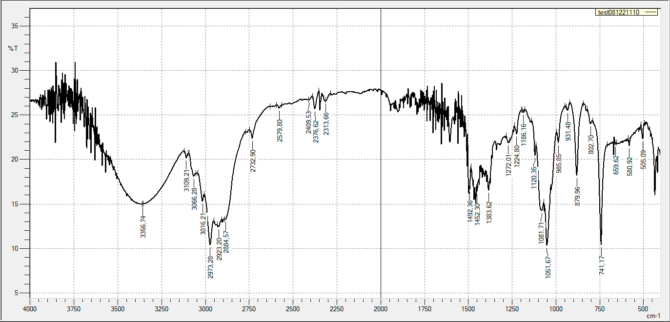 Для спектроскопического анализа использовался метод FTIR. Образцы анализировались на двух приборах: Инфралюм ФТ-08 (Россия) с алмазной приставкой GladiATR (PIKE Technologies, США) и Shimadzu IR Spirit (Япония). Спектры регистрировались в диапазоне 4000–400 см–1 при разрешении 2,0 см–1, с 20 сканированиями для каждого образца. Исследования проводились как с поверхностей («верх» и «низ»), так и со срезов, в случае, если материал был слишком твёрдым. Анализ проводился в лабораториях Евразийского национального университета им. Л.Н. Гумилёва (г. Астана, Казахстан).