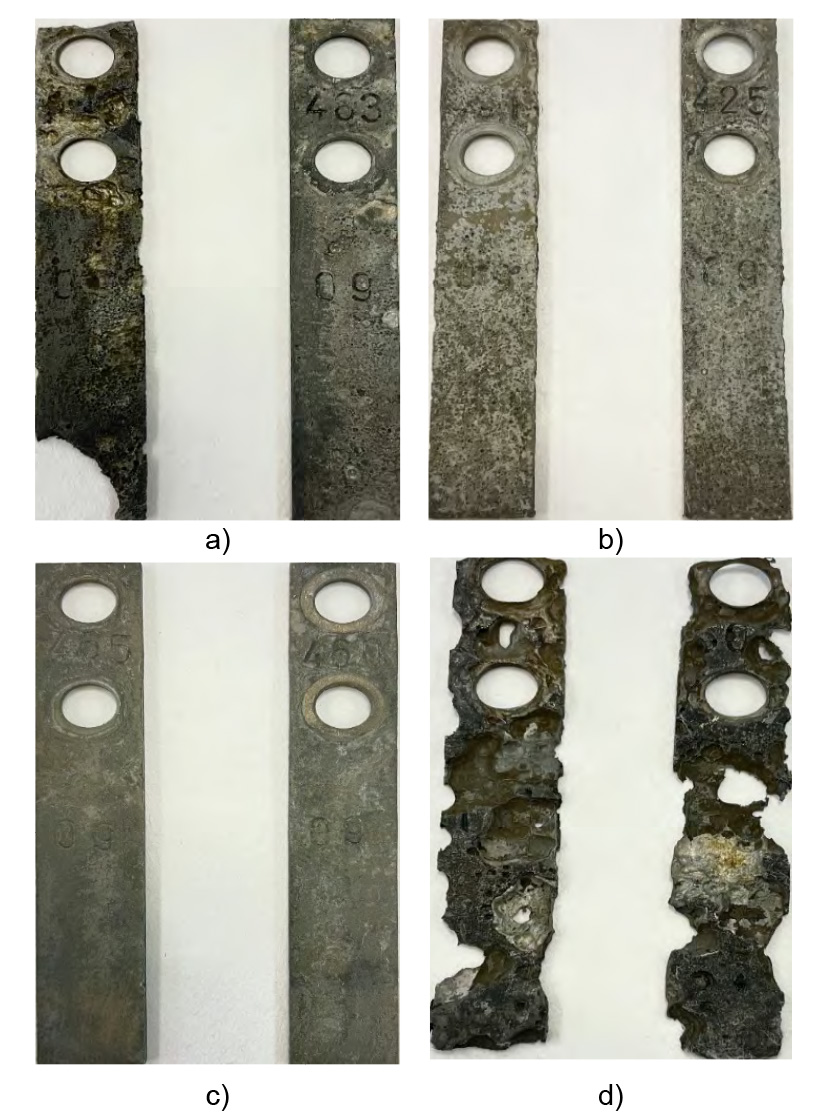 The coupons installed in VST-3 (background), which is not treated with a corrosion inhibitor, exhibited severe corrosion damage. Pitting depressions and pronounced maze corrosion were observed on the coupons.