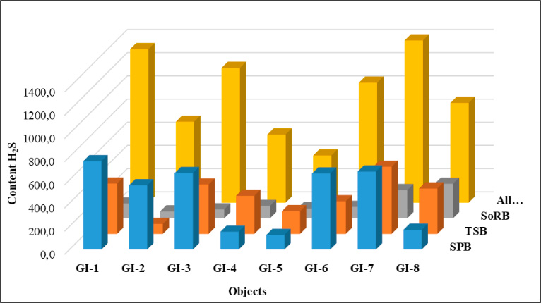 Sampling location | Object | Hydrogen sulfide content, produced by bacteria | Total hydrogen sulfide production | ||