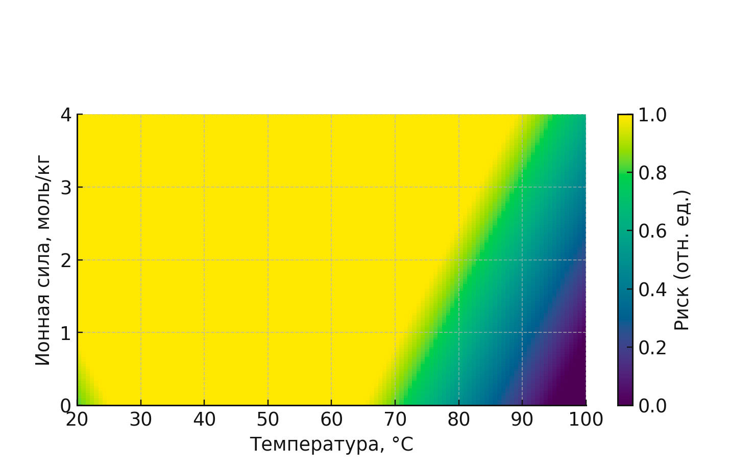 Из данных, приведенных на рис. 1, следует, что в трещине могут возникнуть термобарические условия, способствующие образованию гипса, особенно, если в системе имеется достаточное количество несвязанного двухвалентного железа или в базовой воде повышена концентрация сульфатов. В ядре потока при температурах около 50–70°C время нахождения ионов ограничено, скорее, преобладает перенос ионов Ca²⁺/SO₄²⁻ без немедленного осаждения, но на поверхностях трещин в поровом пространстве, охлаждённых до температур менее 50°C, возможно осаждение гипса или бессанита как метастабильной предшествующей формы, особенно в присутствии железа [1, 7–9]. На рис. 2 показана карта риска осаждения гипса в зависимости от температуры и ионной силы раствора. Важной особенностью обработки высокотемпературных пластов относительно холодными технологическими жидкостями является возникновение довольно значительных тепловых напряжений. При быстром изменении температуры на 70–80°C тепловые напряжения становятся сопоставимыми с прочностью пород на разрыв (десятки МПа по порядку величины). В таких условиях могут образовываться микротрещины, увеличивающие удельную поверхность взаимодействия с пониженной температурой. Как следствие, повышается вероятность появления гетерогенных центров кристаллизации CaSO₄, и, согласно концептуальной карте, риск осаждения гипса возрастает [10–12].