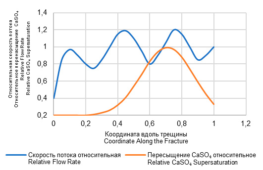 - Отдельно рассмотрена роль трещины ГРП при протекании реакций перехода ангидрита и осаждении гипса. Показано, что из-за неоднородной геометрической конфигурации трещин и температуры в трещинах возможно интенсивное переосаждение гипса.