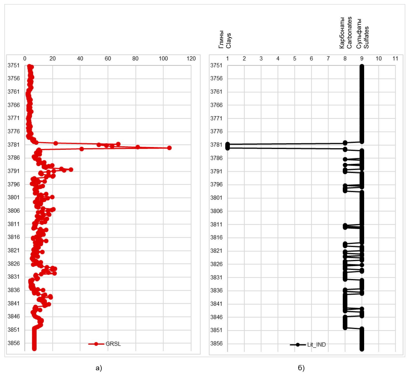а) данные гамма-каротажа / gamma-ray log data; б) литологическое строение пласта / lithological structure of the reservoir