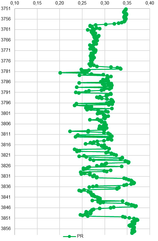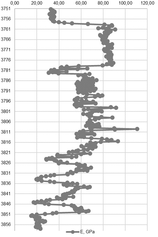 После выполнения работ по кислотной стимуляции на одном из газовых месторождений, расположенных в Средней Азии, оказалось, что после стимуляции дебиты газа снизились по сравнению с таковыми до воздействия. На рис. 4 приведена основная геофизическая информация о пласте. Плотность пород, значение естественной радиоактивности варьируются в весьма высоких пределах, что может указывать на довольно сложное строение пласта. На рис. 5 представлено расчётное строение пласта. Из расчёта видно, что пласт представляет собой довольно сложное чередование карбонатов и сульфатов, что осложняет выполнение успешной стимуляции из-за осаждения осадков в естественных и техногенных трещинах. Поскольку пласт насыщен газом, то, кроме проблем с осаждением сульфатов, могут возникнуть осложнения из-за водной блокады, приводящие к снижению фазовой проницаемости газа, если не применяются технологические флюиды с повышенной энергией (за счёт добавления газов) или эмульгированных систем. Не исключено, что в пласте развита естественная трещиноватость. На рис. 6 приведены расчётные значения напряжений, свойственные рассматриваемому пласту, на рис. 7 и 8 – расчётные значения коэффициентов Пуассонов и модулей Юнга. Из расчёта следует, что в пласте выделяются мощные барьеры для техногенных трещин в вертикальном направлении, т.е. трещины ГРП, скорее всего, формируются в целевой зоне пласта. Следовательно, проблема прорыва трещин в нецелевые зоны не может объяснить существенное снижение дебитов после КГРП.