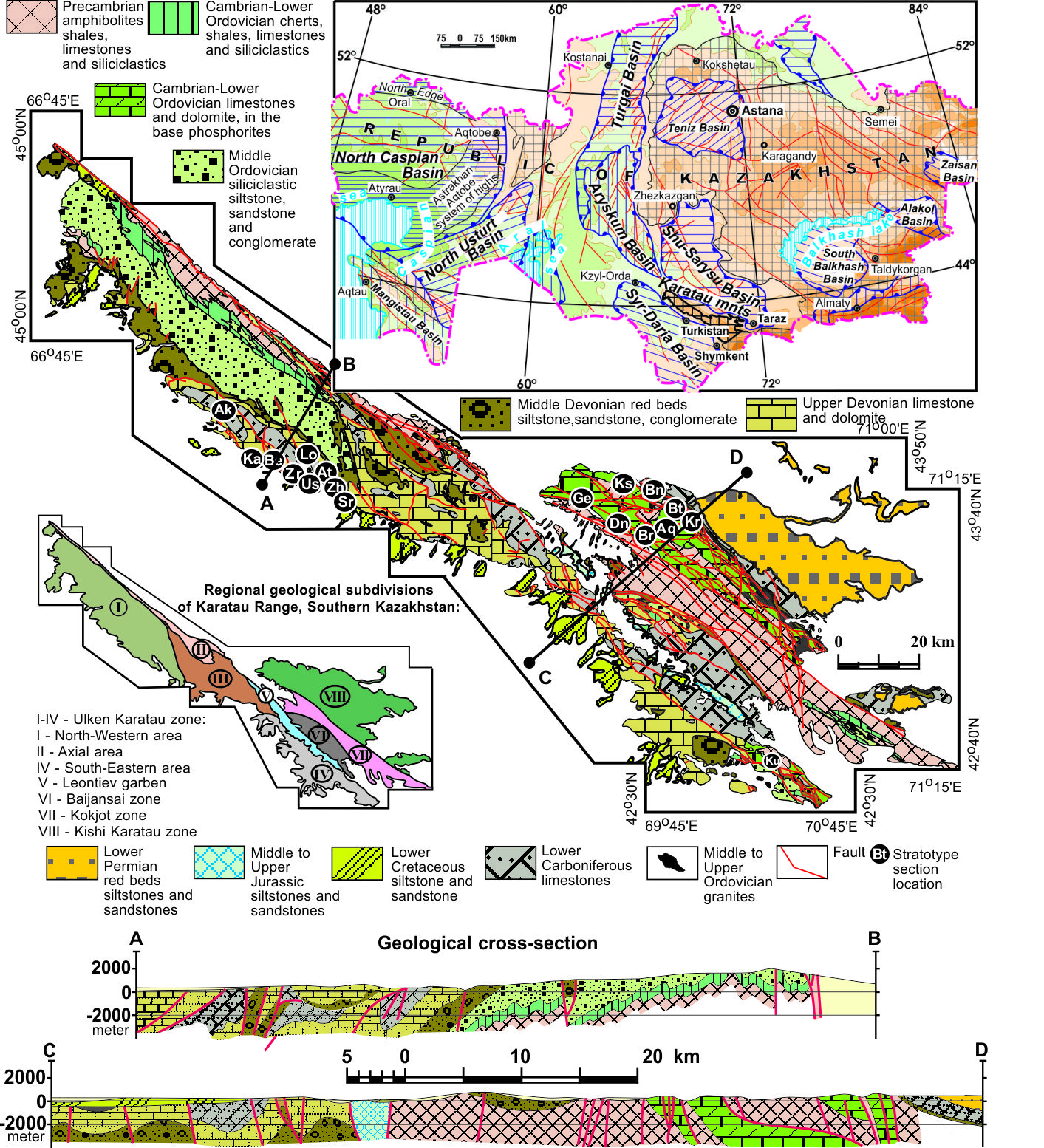Figure 1. Geological map and representative cross-sections of the Karatau Range (Southern Kazakhstan)