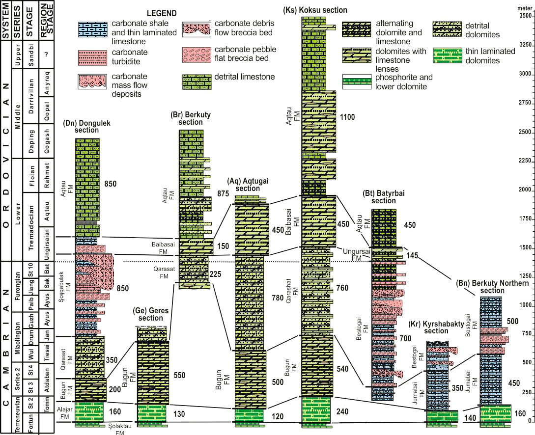 The Early Palaeozoic succession includes Cambrian-Lower Ordovician carbonates [5] characterized by a very diverse shallow- and deep-water facies (Fig. 2) and Ordovician siliciclastic deep-water turbidites which are dated by the fauna of trilobites, graptolites, and conodonts [1, 2]. The end of this early Palaeozoic stage is marked by Caledonian orogeny and associated intrusions of the Upper Ordovician granitoids in Maly Karatau [2]. The orogeny caused significant deformation of the Late Proterozoic and early Palaeozoic siliciclastic-carbonate succession including the overthrusting and assemblage of tectonic packages in the form of monoclinal-flexural blocks and overthrusting [6, 7] (Fig. 1, geological cross-section C–D [7]). However, the original basin stratigraphy including basin-wide palaeogeographical zoning has been well preserved.