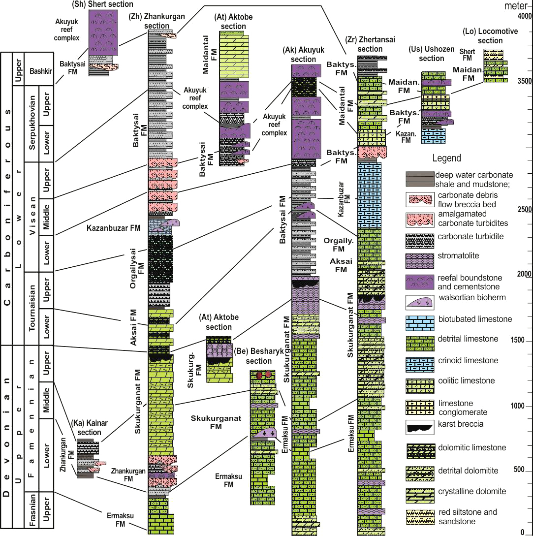 Figure 3. Stratigraphic correlation diagram of Famennian and Lower Carboniferous of North-Western Karatau area (modified after [9])