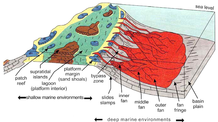 The carbonate massifs are characterized by significantly higher thicknesses of reef-building sediments compared to their coeval deep-water basin fine grained sediments, and a narrow transition zone between the two, where sediments shed of from the platform form steeply dipping wedge-shaped deposits commonly referred to as carbonate slopes [5, 8] (Fig. 4).