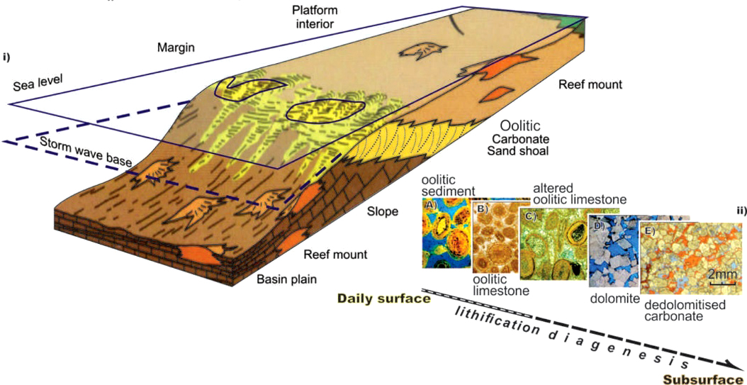 Note that maximum diagenesis in the Karatau carbonates is confined to the marine oolitic sand shoal facies on the platform margin and is characterized by dolomitization of the primary limestone sediment