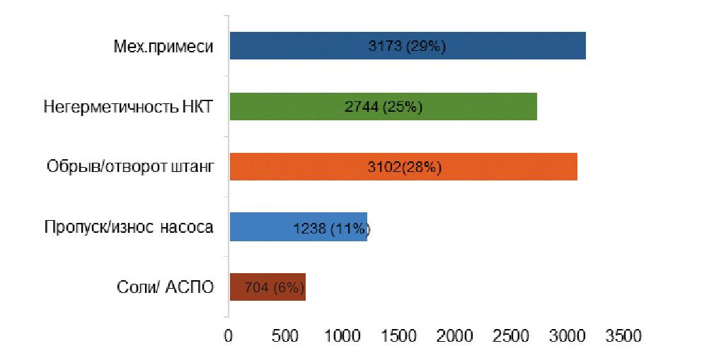 По состоянию на 2020 г. на месторождениях ОМГ продолжительность МРП в среднем составляет 74 дня при количестве ремонтов 10 429 ед. без геолого-технических мероприятий (далее – ГТМ) и 15 975 с ГТМ. Существует множество факторов, влияющих на такой низкий показатель продолжительности МРП. Одним из основных факторов, негативно влияющих на продолжительность МРП, является отказ глубинного оборудования из-за негерметичности лифта, обусловленного протиранием (механическое разрушение) и коррозией труб, приводящих к потере целостности колонны НКТ. 53% от общего количества отказов составляют отказы по НКТ и насосные штанги (далее – НШ) (рис. 1 и 2).