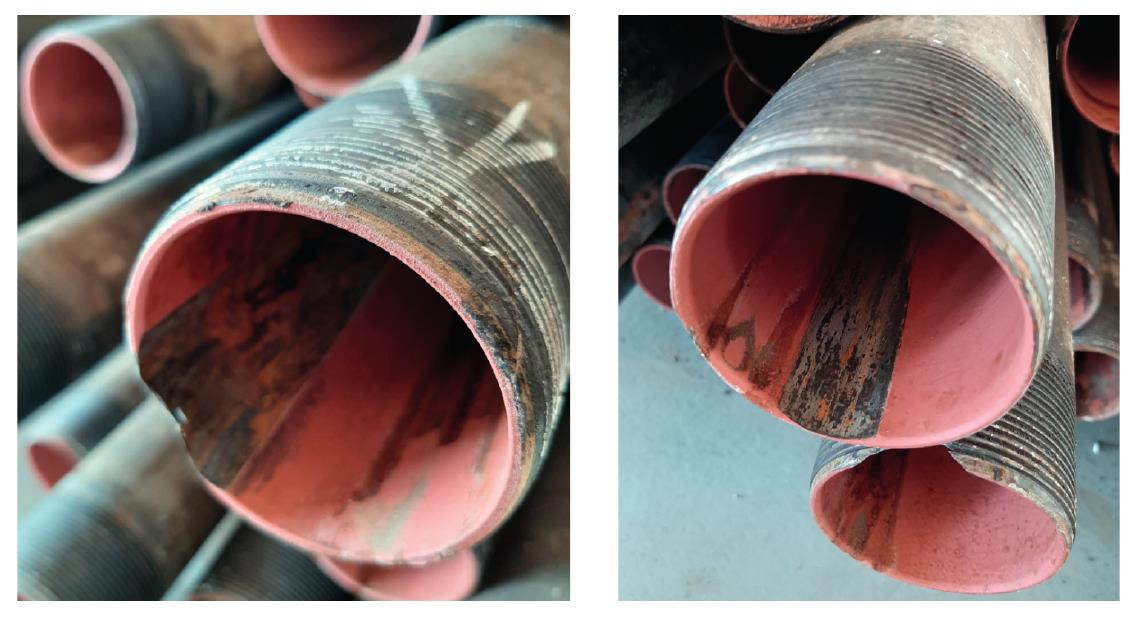 - истирание или протирание НКТ происходит в результате трения штанг и муфт о стенки труб при длительной их работе в искривленных скважинах (рис. 3). В процессе истирания НКТ штангами глубинного насоса при возвратно-поступательном движении и в присутствии агрессивной среды (H2S, CO2, Cl-) усиливается фреттинг-коррозия, которая развивается за счет электрохимического разрушения. В зоне контакта металлов образуются продукты коррозии (карбонат железа, сульфид железа, оксиды и т.д.), из-за которых активизируется механический износ. Далее происходит разрыхление и разрушение продуктов коррозии под воздействием штанг. После этого протекает ускоренная коррозия металла из-за воздействия агрессивной среды.