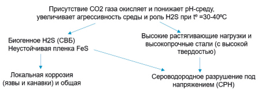 Согласно отчетам [4–6], процесс коррозии на месторождениях ОМГ можно показать схематически (рис. 7):