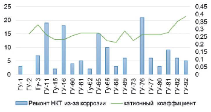 Рисунок 9. Зависимость между ремонтами скважин и катионным коэффициентом