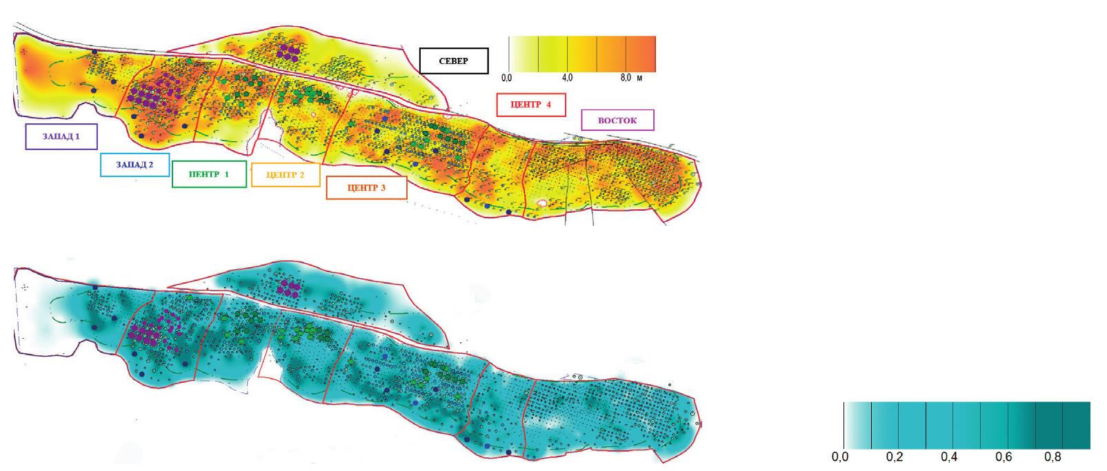 Зоны ЦЕНТР-1, ЦЕНТР-2 и ЦЕНТР-3 наиболее соответствуют критериям применимости метода ВПП нагнетательных скважин. Они отличаются повышенными значениями обводненности продукции и ПИО, компенсации отборов жидкости закачкой и среднего дебита жидкости, находятся на поздней стадии разработки. В связи с этим в Концепции было рекомендовано массовое проведение в этих зонах работ по ВПП нагнетательных скважин. Соответствующие скважины отмечены в картах, представленных на рис. 1, зелеными и салатовыми кружками.