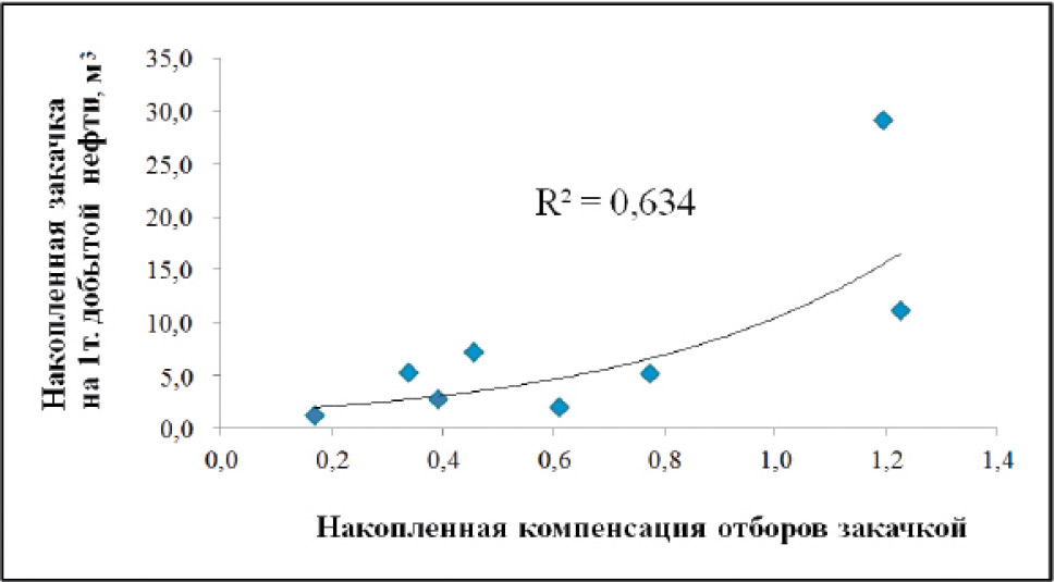На рис. 2 представлена построенная по ним графическая корреляция величин удельного объема закачки, т.е. величины накопленного объема закачки, приходящейся на 1 т добытой нефти, и накопленной компенсации отбора жидкости закачкой. Корреляция позволяет отметить, что при превышении компенсацией значения 1,0 удельная закачка заметно возрастает, что объясняется эффектом «языкообразования» фронта вытеснения из-за высокой вязкости нефти и холостыми потоками закачиваемой воды вдоль пласта по промытым каналам. В связи с этим на данном месторождении не рекомендуется выдерживать компенсацию выше 1.