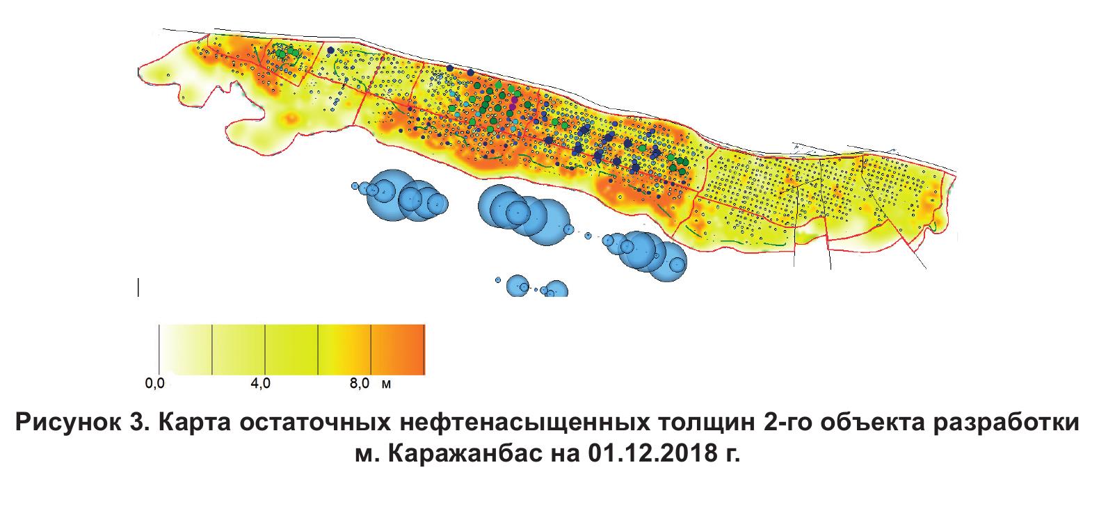 Рисунок 3. Карта остаточных нефтенасыщенных толщин 2-го объекта разработки м. Каражанбас на 01.12.2018 г.