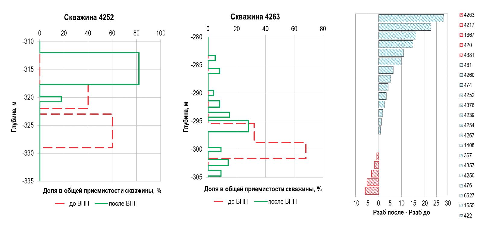 Анализ показал, что участки воздействия обработанных скважин в основном совпали с участками, рекомендованными в Концепции. Анализ результатов промыслово-геофизических исследований в обработанных скважинах показал, что в большинстве случаев после ВПП отмечается смещение их профилей приемистости (рис. 4а и 4б), а также увеличение забойного давления нагнетания (рис. 4в), что указывает на тампонирование промытых водой интервалов нефтяного пласта.