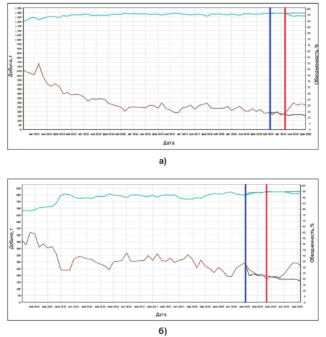 Результаты ВПП в нагнетательной скв. № 523 1-го объекта разработки представлены на рис. 5а. Коричневой линией на рисунке представлена динамика добычи нефти участка воздействия данной нагнетательной скважины, черной − динамика базовой добычи нефти, голубой − обводненности продукции, серой − динамика ее базового значения. Результаты ВПП в нагнетательной скв. № 6527 2-го объекта представлены на рис. 5б.