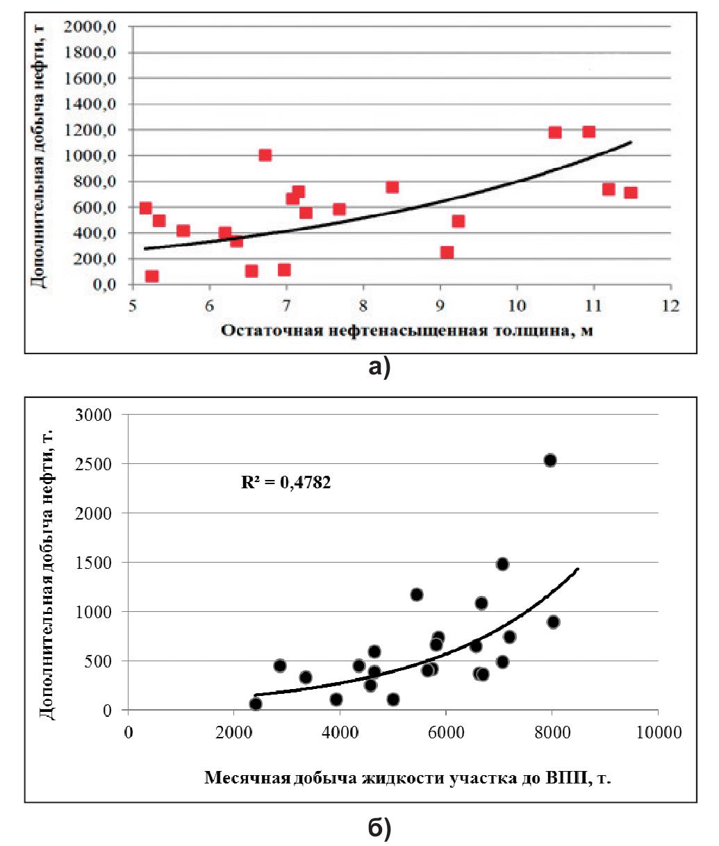 На рис. 6 графически представлены зависимости величины дополнительной добычи нефти на участке воздействия данной нагнетательной скважины после проведения ВПП от величины средней нефтенасыщенной толщины пласта, т.е. «плотности» остаточных извлекаемых запасов нефти, а также от величины месячной добычи жидкости на данном участке.