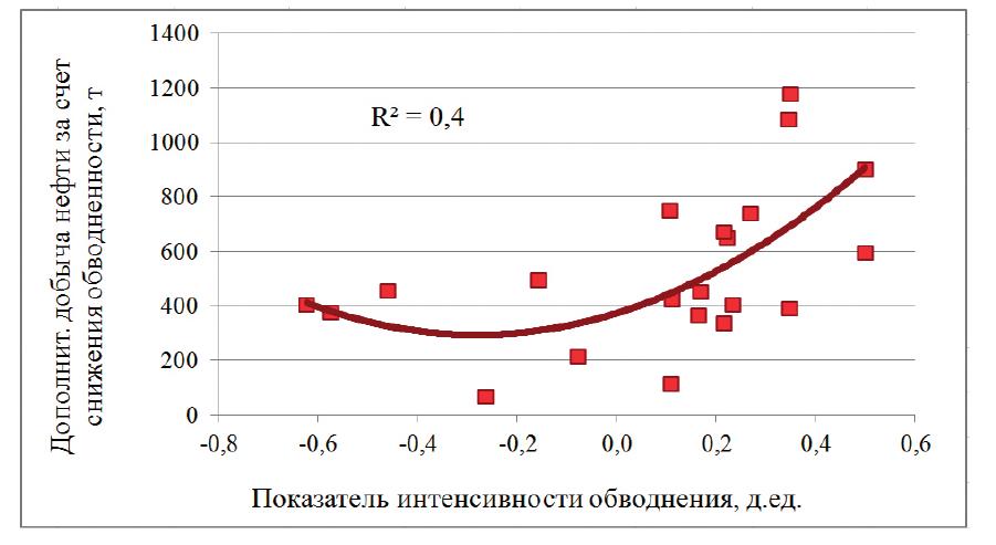 На рис. 7 представлено прямое влияние на величину дополнительной добычи нефти на участке воздействия данной нагнетательной скважины за счет снижения средней обводненности его продукции после проведения ВПП от величины превышения среднего значения обводненности над выработанностью приходящихся НИЗ нефти. Данное превышение названо показателем интенсивности обводнения продукции.
