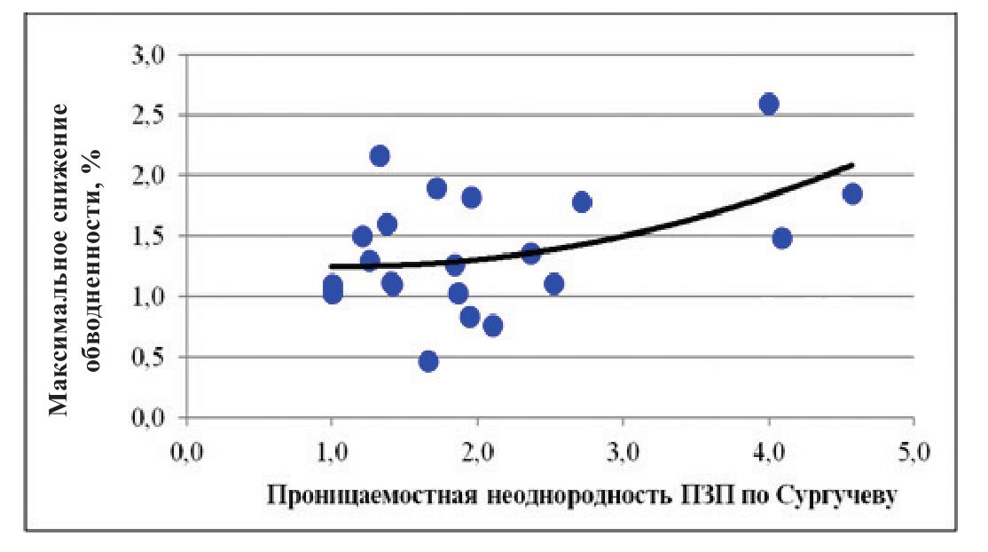 На рис. 8 графически представлено прямое влияние величины вертикальной проницаемостной неоднородности в призабойной зоне пласта (далее – ПЗП) нагнетательной скважины, выраженной по методу М.Л. Сургучева, на максимальную величину снижения средней обводненности окружающих реагирующих скважин после ВПП. Недостаточная четкость данной зависимости объясняется тем, что эффективность метода ВПП на данном месторождении обусловлена не только проницаемостной неоднородностью пласта, но и высокой вязкостью пластовой нефти, обусловливающей высокое соотношение вязкостей вытесняемого и вытесняющего флюидов, что приводит к интенсивному «языкообразованию» фронта вытеснения. Поэтому эффективные ВПП на м. Каражанбас могут отмечаться и при относительно невысокой проницаемостной неоднородности пласта.