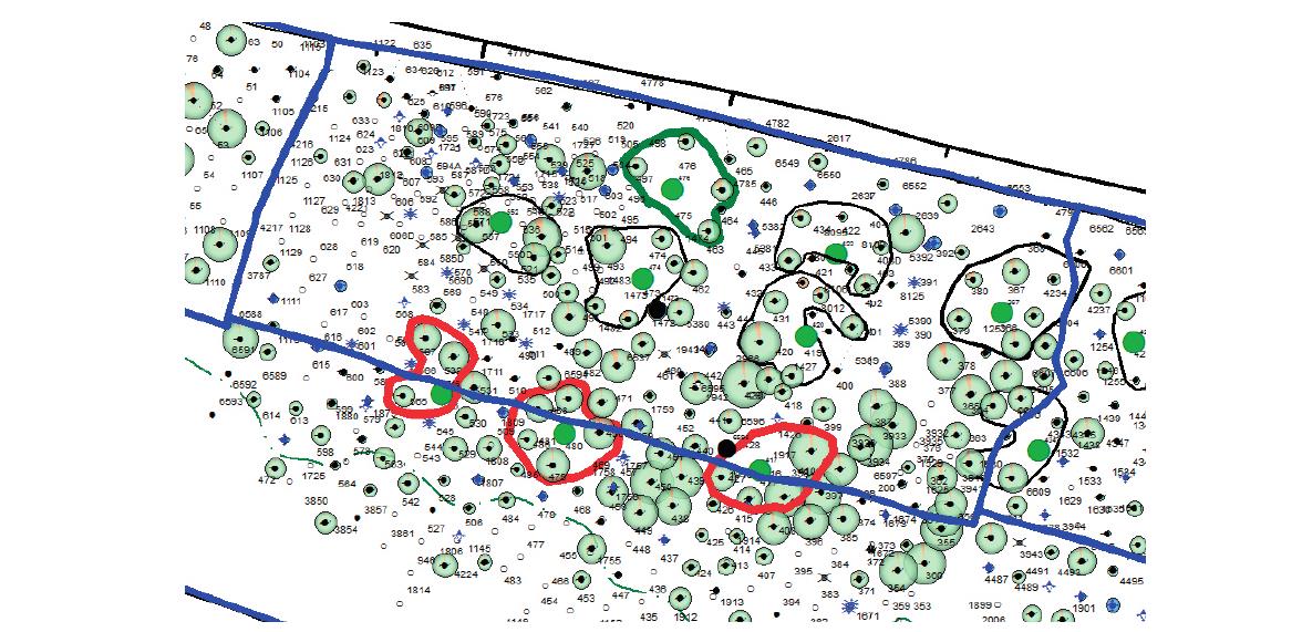 Фактором, оказывающим не менее заметное влияние на эффективность ВПП на 2-м объекте разработки, является удаленность обрабатываемой скважины от законтурного ряда нагнетания воды в пласт. Чем она меньше, тем ниже эффективность ВПП. В качестве примера на рис. 9 представлена карта центрального участка данного объекта, на которой красными конурами отмечены участки воздействия нагнетательных скв. № 417, 481 и 546 с наименьшей «относительной» эффективностью ВПП, а зеленым контуром отмечен участок воздействия нагнетательной скв. № 476 с наибольшей «относительной» эффективностью. Относительной эффективностью названо частное от деления дополнительной добычи нефти участка к общей его добыче после проведения ВПП.