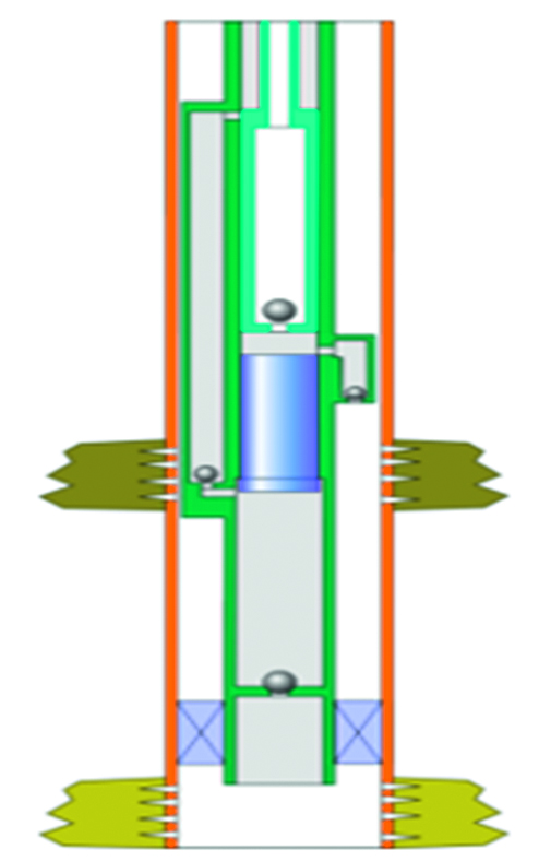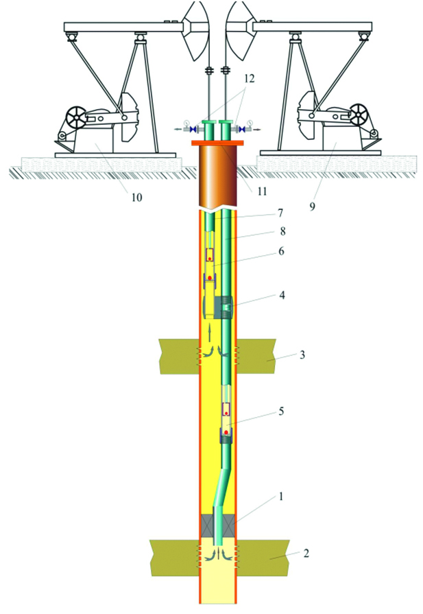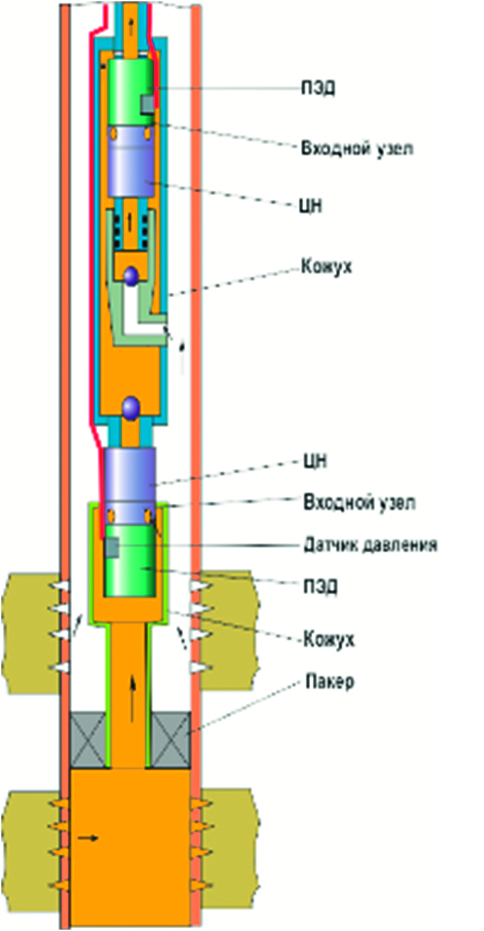 При помощи 2 кожухов, в которые герметично помещаются ЭЦН или ЭВН, разграничиваются потоки с нижнего и верхнего пластов, разделенных пакером (рис. 7) [3].