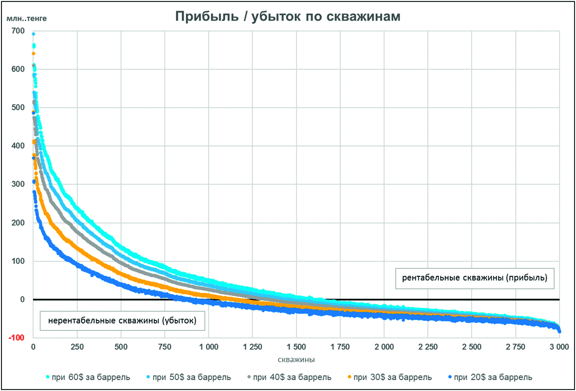 Таким образом, разграничение скважин по предлагаемому подходу на рентабельные и убыточные позволит выработать гибкие управленческие решения, направленные на обеспечение эффективной эксплуатации месторождений даже в условиях волатильности цен на нефть.