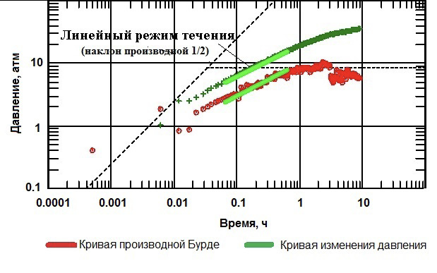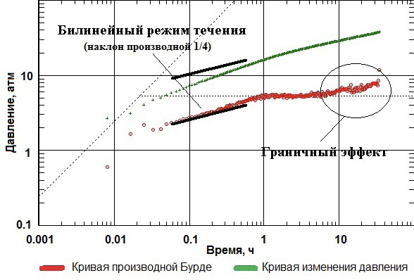 Анализ диагностического графика на раннем этапе исследования показал наличие наклона производной, характеризующей билинейное течение по техногенной трещине конечной проводимости. Также отмечается граничный эффект, связанный достижением отклика давления разлома (рис. 6).