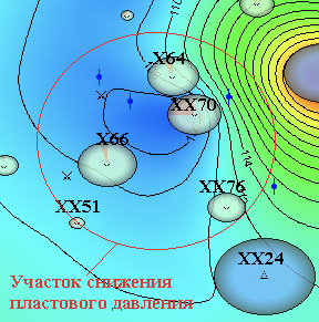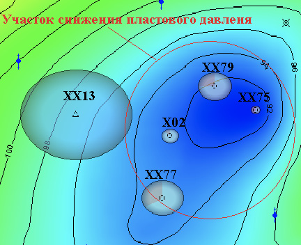 На карте изобар, проиллюстрированной на рис. 2, в окружении нагнетательной скважины XX13, несмотря на высокую текущую (175%) и накопленную (249%) компенсацию, отмечается снижение пластового давления.
