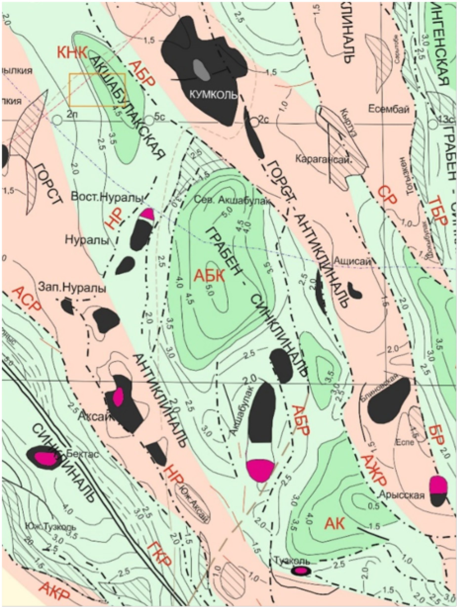 Южно-Тургайский бассейн, где нефтяные и газовые залежи выявлены в основном в юрских и меловых отложениях, является самым молодым осадочным бассейном в Казахстане. Он состоит из трех блоков: Жиланшикский, Арыскумский прогибы и Мынбулакская седловина между ними (рис. 1). Геологоразведочные работы начались в этом регионе в 1970-х гг. В данном бассейне сейчас обнаружены в общем количестве 52 нефтегазовых месторождения и структуры (рис. 1), выработанность начальных извлекаемых запасов некоторых из них достаточно высока, например, выработанность м. Кумколь составляет 83% [1]. Ввиду уменьшения остаточных извлекаемых запасов нефти почти всех месторождений определение происхождения нефти и прогноз направления миграции углеводородов (далее – УВ) являются актуальной темой для обоснования глубокого бурения до палеозоя. Однако, несмотря на высокую степень изученности разными методами и продолжающиеся разведочные работы в Южно-Тургайском бассейне [1–4], до сих пор отсутствует общепринятое представление о происхождении нефти, т.к. взгляды геологов-исследователей разнятся по этому вопросу: например, некоторые считают [2], что нефти Арыскумского прогиба имеют глубинное происхождение, хотя другие [3, 4] полагают, что среднеюрские глинистые толщи в этом районе являются основными нефтематеринскими породами. Также существует мнение исследователей [5], что палеозойские отложения Южного Тургая малоперспективны из-за отсутствия надежных покрышек.