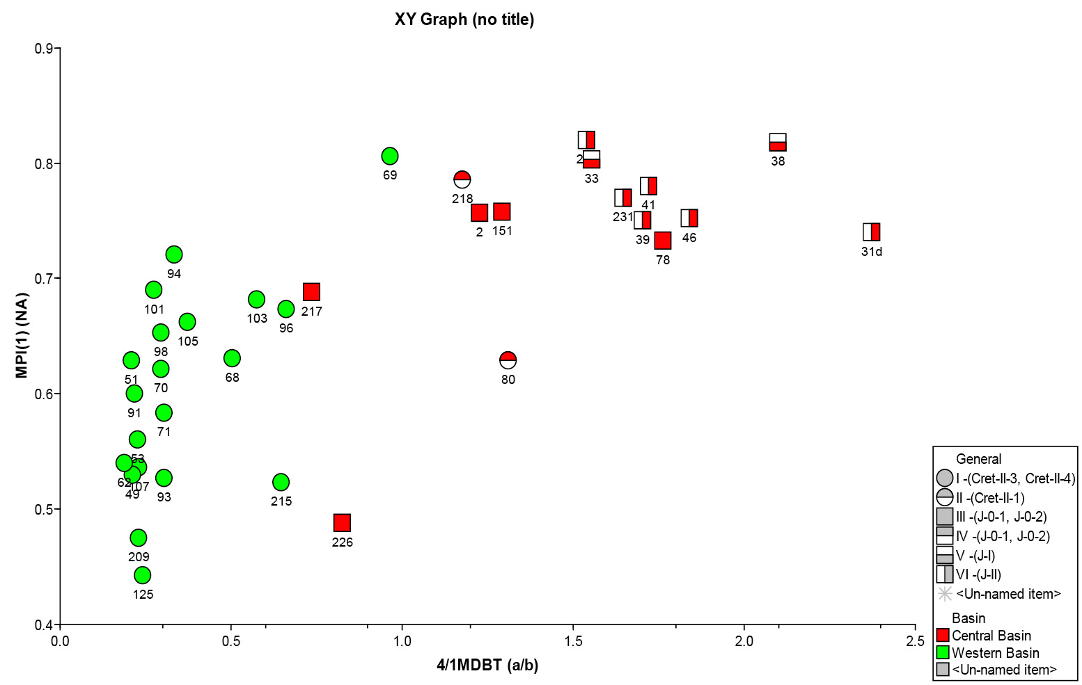 Термическая зрелость. В этой работе для оценки термической зрелости проб применялся график зависимости соотношения 4MDBT/1MDBT от индекса метилфенантрена (MPI-1), т.к. их значения возрастают с увеличением термической зрелости. По данному графику (рис. 3) видно, что нефти Центрального Нуралы испытывали более высокие температурные условия во время генерации, по сравнению с образцами Западного Нуралы. Если посмотреть латерально, то термическая зрелость проб Центрального Нуралы уменьшается с северо-восточной части Нуралы в сторону юго-западной части, что также может указать на направление вторичной миграции УВ.