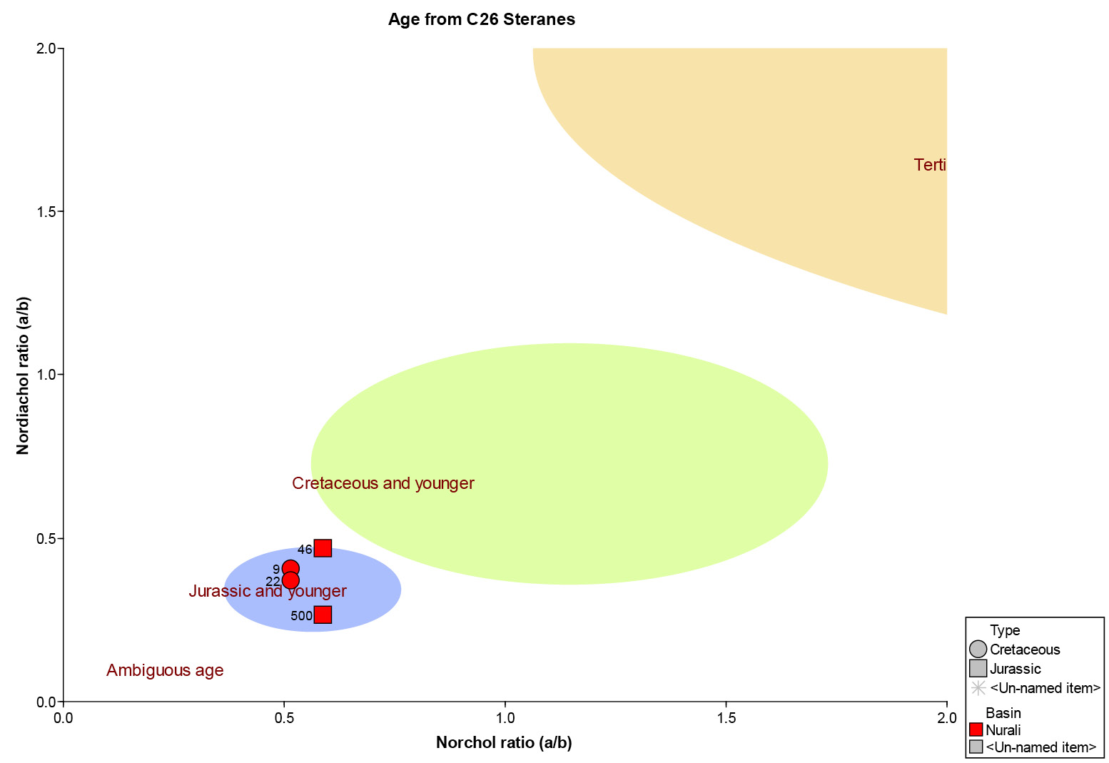 Определение возраста нефтематеринских пород. Как и в палеонтологии, эволюция биомассы и микроорганизмов происходила в разных эрах; в результате поступательного развития жизни на смену одним группам организмов приходили другие [10]. НМП, осажденные в разные периоды времени, содержат определенные биомассы, которые послужили источником ОВ. Обнаруженные останки и относительные концентрации этих микроорганизмов в составе нефти позволяют определить возраст НМП исследуемых нефтей. В мировой литературе существует несколько параметров, успешно применяющихся для определения возраста нефтематеринских пород по биомаркерному составу нефти. Но такие параметры следует применять с осторожностью по следующим причинам: во-первых, некоторые из этих параметров имеют ограничения, например, стераны С28/С29 применимы только для НМП, образовавшихся в морских условиях, и, значит, мы не можем применять данный параметр в этой работе; во-вторых, данные параметры должны подтверждаться только по результатам успешной корреляции нефть-нефтематеринская порода, т.к. каждый бассейн может иметь свои особенности и наборы возрастных показателей. В-третьих, возраст НМП нефтей можно более достоверно определить по результатам биомаркерного анализа, проведенного в режиме MRM, который используется для детальной и индивидуальной идентификации биомаркеров, т.к. в режиме SIM происходит наложение пиков, что приводит к неправильному определению возраста. В связи с тем, что биомаркерный анализ в этой работе проводился в режиме SIM, возраст НМП не определили. Однако в 2015 г. нами проводился биомаркерный анализ в режиме MRM для четырех проб нефти м. Нуралы (№ 9, 46 – Центральный Нуралы, № 22, 500 – Западный Нуралы), соответственно, была сделана попытка определить их возраст по графику зависимости норхолестана и нордиахолестана. По данному графику (рис. 5) видно, что возраст НМП исследованных нефтей – юра [9]. Однако для подтверждения возраста НМП исследованных проб рекомендуется провести дополнительные исследования, кроме биомаркерного состава.