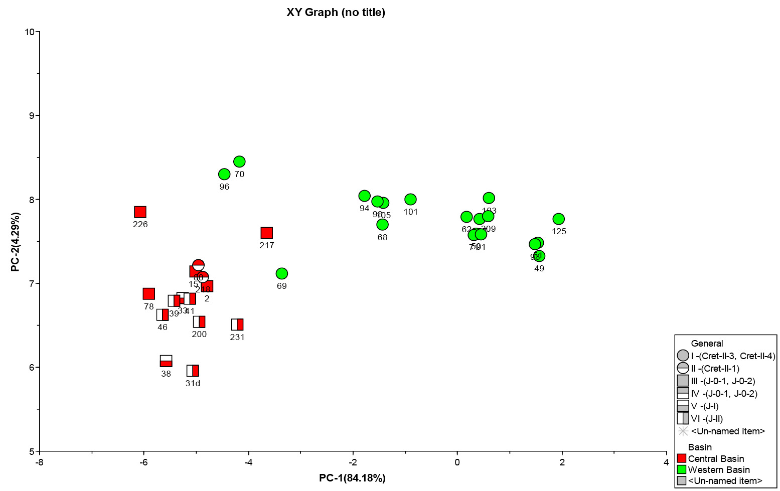 i) Кластерный анализ РСА. Статистический сравнительный анализ РСА был проведен в программном обеспечении PIGI с целью установления генетической типизации нефти по биомаркерному составу. Для генетической типизации нефти применяются 4 вида биомаркерных параметров: параметры для определения среды осадконакопления, фациально-литологические и катагенические показатели. Суть РСА анализа заключается в том, что чем выше процент каждого компонента PC, тем выше охват данных и, соответственно, тем выше достоверность анализа РСА. Компоненты РС-1 и РС-2 составляют 84,18% и 4,29% общей изменчивости (variables) соответственно. Был построен график зависимости компонентов РС-1 и РС-2, охватывающих 88,47% общей изменчивости (рис. 6). По данному графику видно, что все нефти Центрального Нуралы и 3 пробы № 69, 70 и 96 Западного Нуралы образуют общую группу, что указывает на их генетическое единство, хотя нефть скв. № 226 находится далеко. Остальные нефти можно отнести ко второй группе, хотя нефти самой южной части м. Нуралы находятся в середине двух групп;