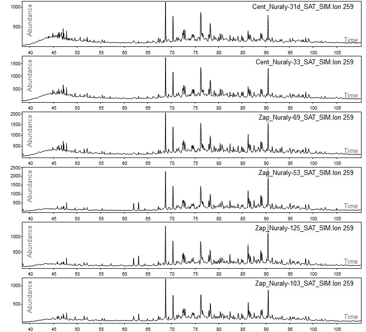 ii) Визуальное сравнение масс- фрагментограмм. Как видно из визуальных сравнений на масс-фрагментограмме диастеранов по m/z 259 в представительных нефтях (рис. 7) Западного Нуралы, скв. № 53, 125 и 103, присутствуют дополнительные пики, которые отсутствуют в представительных нефтях Центрального Нуралы, хотя нефть скв. № 69 генетически больше близка к нефтям Центрального Нуралы.