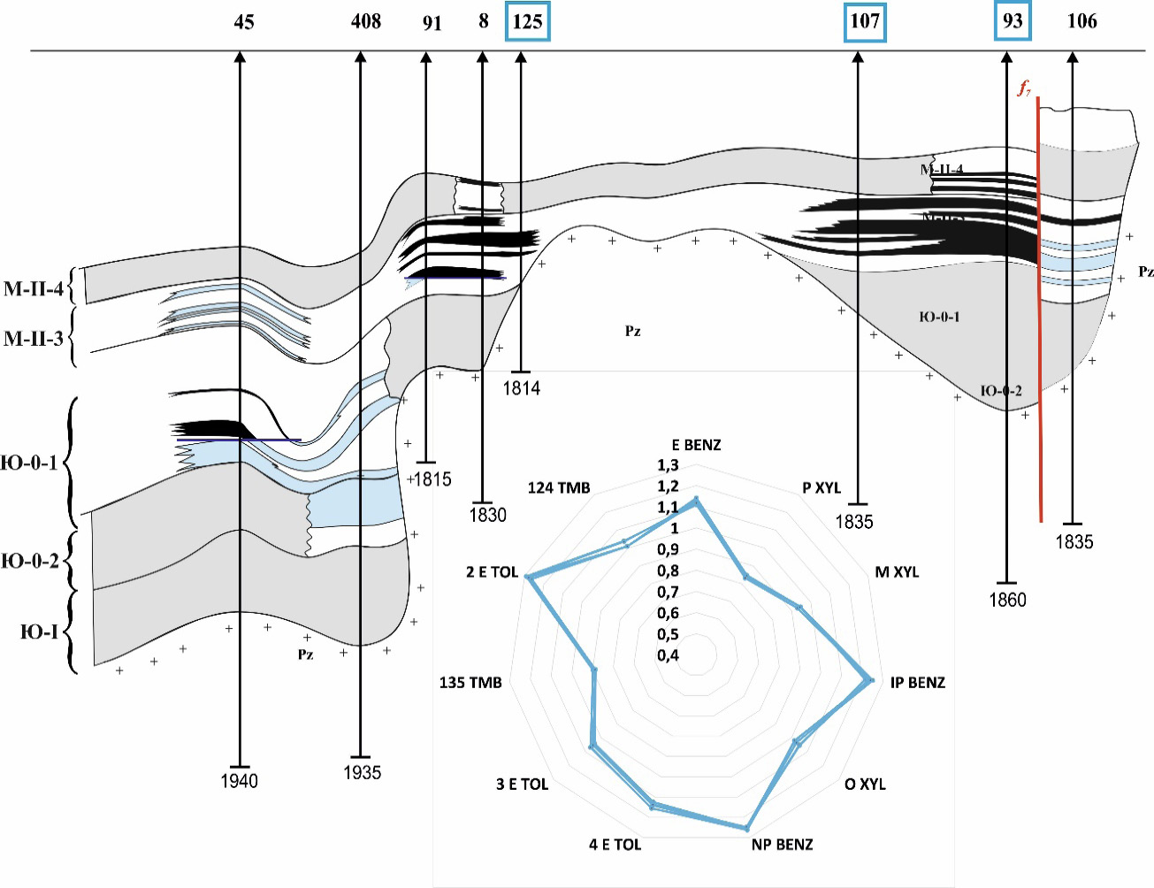Как видно на рис. 8, показатели нефти, отмеченные зеленым в звездчатой диаграмме, лежат между показателями нефтей, отмеченных красним и синим, что указывает на их смесь. Таким образом, нефти третьей группы являются смешанным вариантом нефтей из первой (красной) и второй (синей) групп. Из этого напрашивается вывод, что залежь в южной части Западного Нуралы (группа 3), вероятно, сформировалась за счет поступления и смешения УВ-флюидов из северо-восточного направления (группа 1) и северо-западного направления (группа 2) (рис. 12). Информацию по флюидосообщаемости надо учесть при построении геологических карт. Например, звездчатые диаграммы нефтей из скв. 125, 107 и 93 очень схожи, что позволяет предположить единство резервуара на этом участке Западного Нуралы (рис. 9).