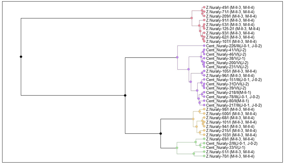 Дендрограмма Варда. Программное обеспечение Malcom выдает схематичные «семейные древа» нефти, так называемые «дендрограммы», основанные на методе Варда (Wardmethod) [10]. Дендрограмма показывает степень близости отдельных объектов и кластеров, а также наглядно демонстрирует в графическом виде последовательность их объединения или разделения. На представленной дендрограмме (рис. 10), построенной по результатам фингерпринтинга нефти, можно выделить 4 группы нефтей, отмеченных разными цветами. По результатам дендрограммы Варда установлено, что нефти коррелируют между собой в основном по горизонту. В последовательном порядке нефти Западного Нуралы отличаются от Центрального Нуралы. За последние десятилетия на м. Нуралы проводятся разные промысловые исследования – геофизические исследования скважин, гидродинамические исследования скважин, трассерные исследования и т.д., во время которых также рекомендуется учесть результаты фингерпринтинга нефти. Например, дендрограмма Варда (рис. 10) позволяет обоснованно подобрать кандидатуры добывающих скважин для перевода под нагнетание.