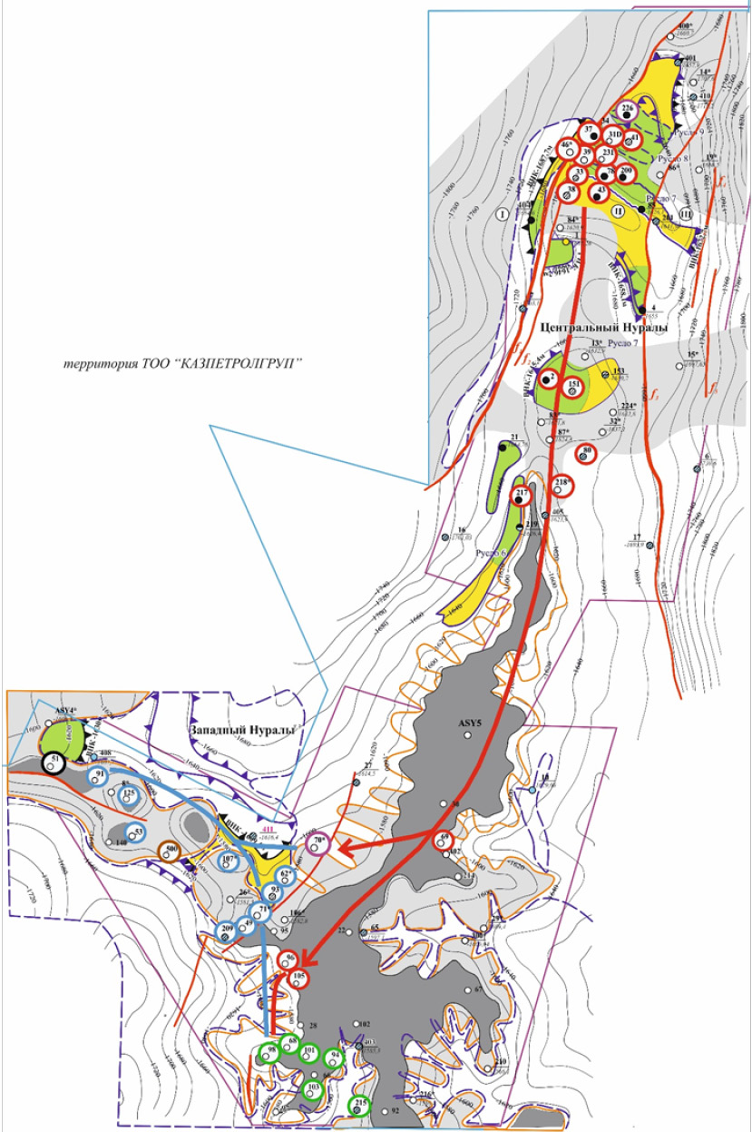 Рисунок 12. Карта распространения выделенных типов нефтей на м. Нуралы с вероятным направлением миграции нефтей по результатам геохимических исследований