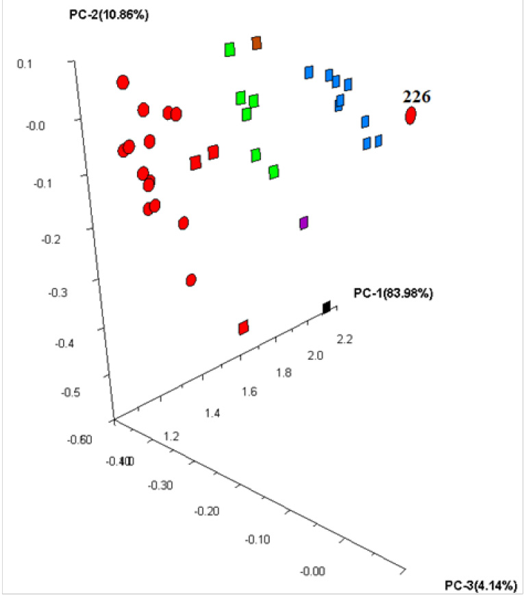 По результатам звездчатой диаграммы и дендрограммы Варда по составу нефть скв. № 226 немного отличается от остальных нефтей Центрального Нуралы, хотя согласно 2D графика она имеет почти положительную корреляцию с нефтями Центрального Нуралы, что требует дальнейших объяснений. В связи с этим был построен график зависимости РС-1, РС-2 от РС-3 в трехмерном пространстве для охвата большей информации по сравнению с плоским изображением на РС-1 и РС-2. На данном 3D-графике, который охватывает 97,14% данных по 12 пикам ароматических компонентов, видно, что значения нефти скв. № 226 вовсе не так близко находятся к остальным (красным) кругам, а впереди всех кругов (рис. 13), а результаты 2D и 3D графиков по остальным пробам хорошо согласуются.