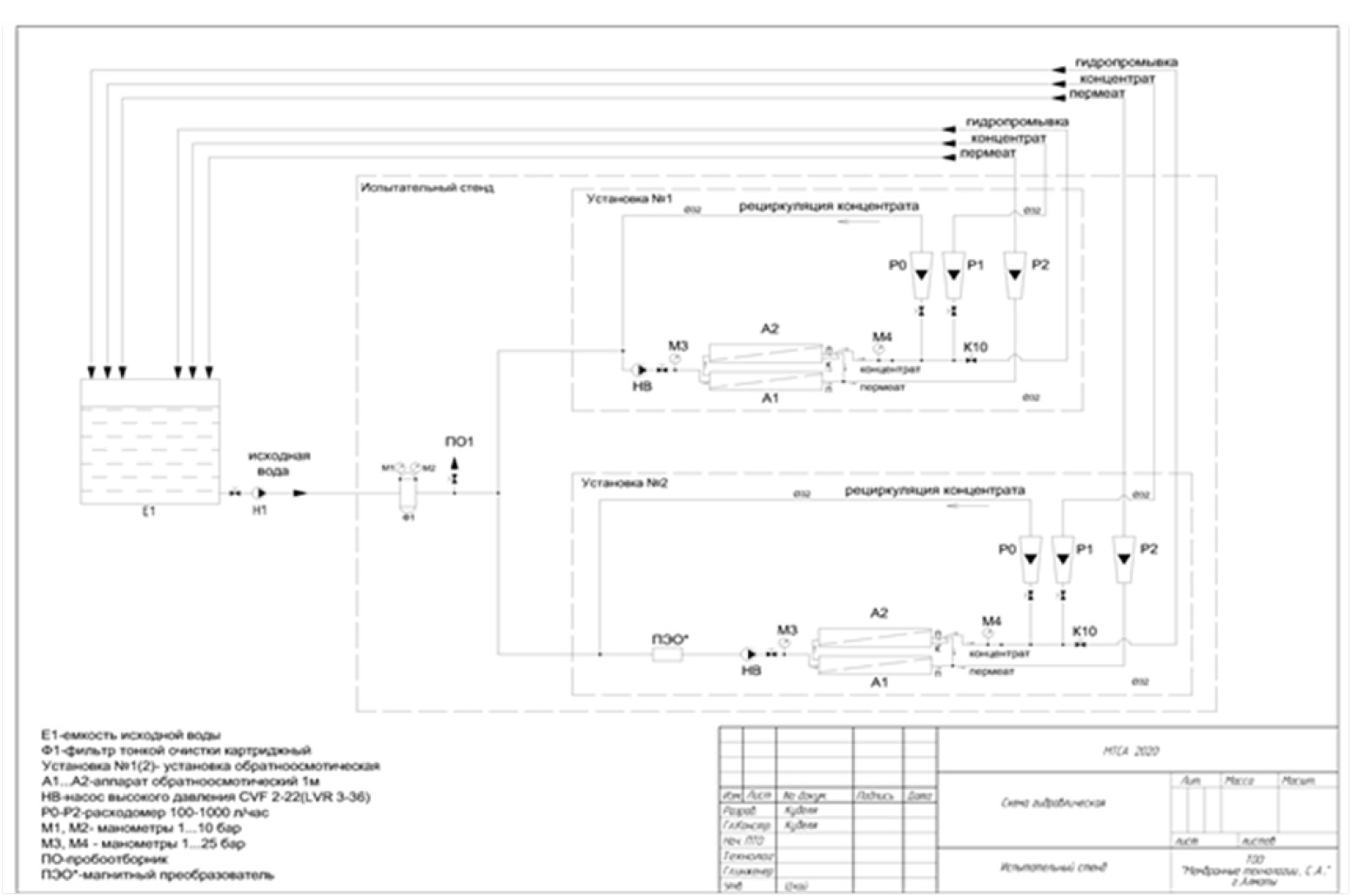 The process flow sheet is presented in Fig. 2, showing how the source water enters tank E1. From tank E1, the water is supplied by pump H1 to mechanical filter F1 with a filtration threshold of 5 microns, then the water enters the reverse osmosis plant with a capacity of 300 l/h. In the plant, the filtered water is supplied by the HB high-pressure pumps to the block of reverse osmosis elements A1–A2. The EWTD is installed before the HB high-pressure pump, after the tie-in point of the recirculation line. The consumption of the concentrate, permeate, and concentrate recirculation are controlled by rotameters P1, P2, P0, respectively. The operation of the F1 filter is controlled by the pressure drop-pressure gauges M1, M2. The operation of reverse osmosis elements A1-A2 is controlled by rotameters P1, P2, P0 and by the pressure drop on pressure gauges M3, M4. The test bench operates as a closed circuit, i.e. the permeate and brine return to the original tank.